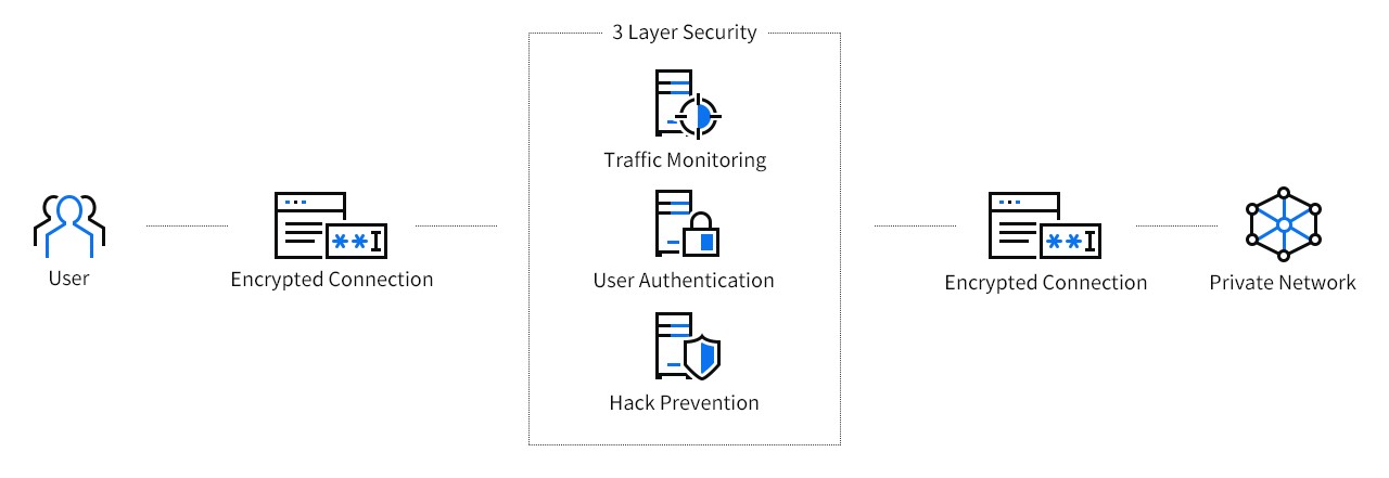보안 기능 또한 제공한다. 모든 트래픽을 모니터링해 비정상 침입을 감지하고 차단함으로써 해킹 시도나 악성 소프트웨어의 접근, DDoS 등의 공격을 방어한다. 사용자와 서버 간 모든 트래픽은 기본적으로 암호화되어 전송되며, 보다 강화된 인증보안을 위해 다중 인증(Multi-Factor Authentication) 기능을 제공한다.