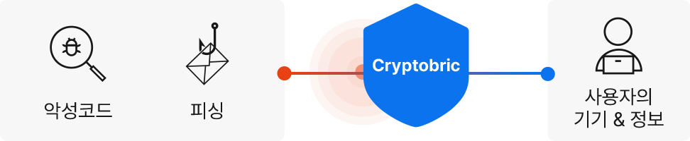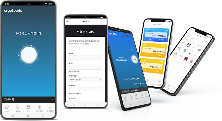 크립토브릭(Cryptobric)은 Cloudbric Labs의 사이버 위협 데이터(Threat DB)를 기반으로 위협 정보가 사용자에게 접근하는 것을 방지하여 해킹이나 피싱 등 웹 기반 위협으로부터 사용자를 보호하는 기술인 보안 웹 게이트웨이(SWG, Secure Web Gateway)를 구현한 개인 모바일 보안 솔루션입니다.