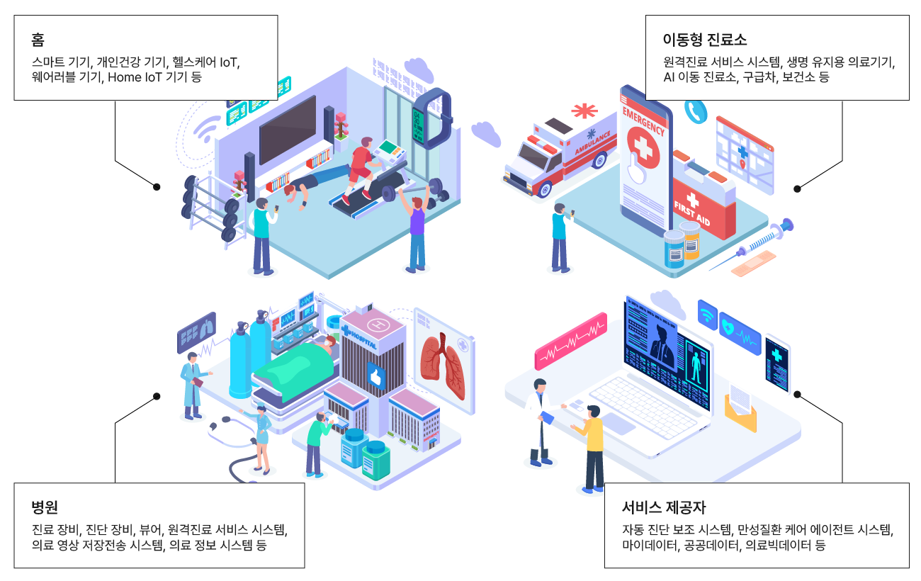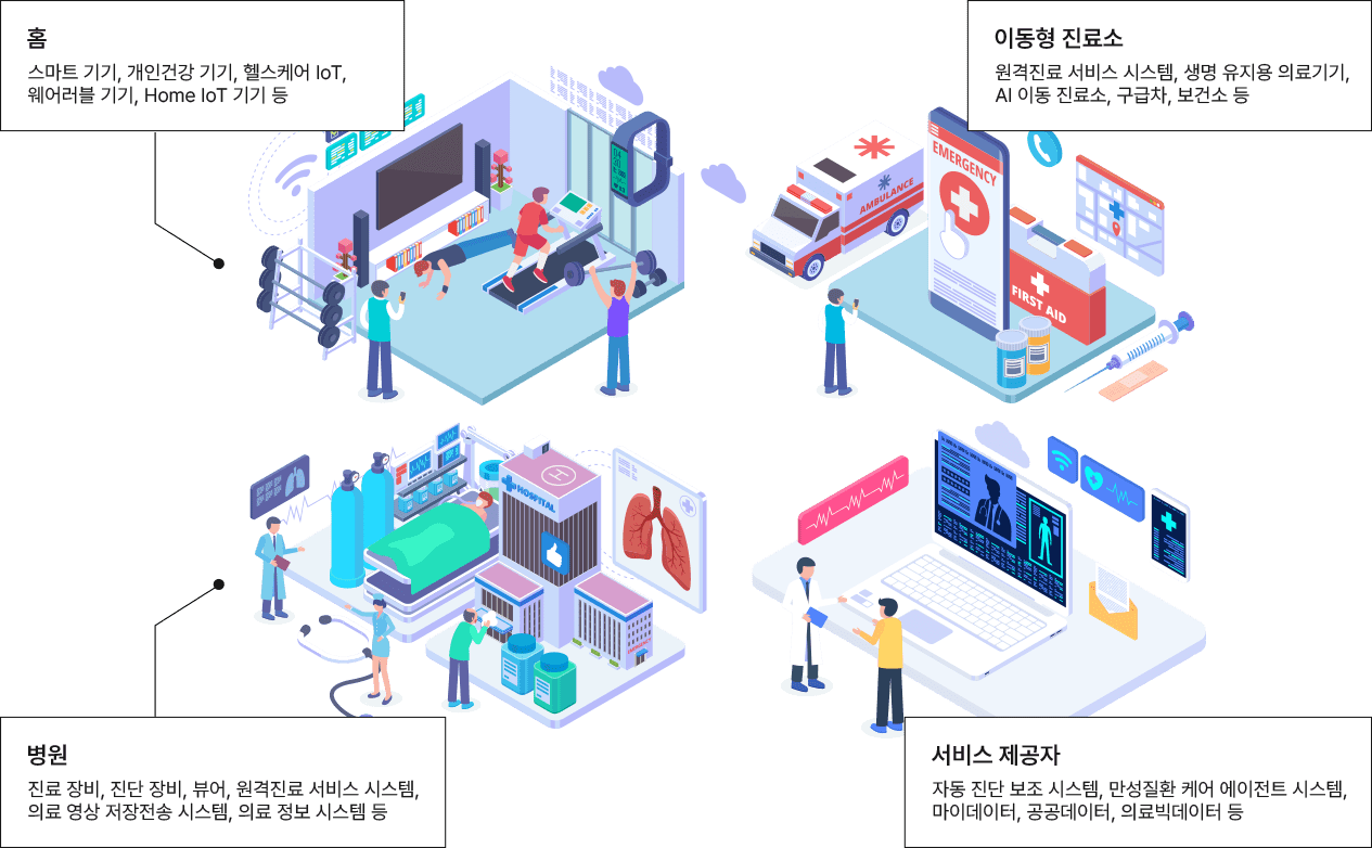 최근 유무선 네트워킹 기술의 발달로 과거 병원 폐쇄망 내 설치형 의료 기기를 활용한 의료 서비스에서 IoT, 클라우드, 빅데이터, AI 기술과 융합한 디지털 헬스케어 서비스로 발전하고 있습니다.